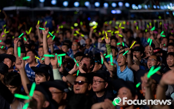 (서울=포커스뉴스) 22일 오후 서울 광화문광장에서 열린 2016 재벌개혁 시민한마당에서 전국금속노동조합(금속노조)이 율동공연을 보며 야광봉을 흔들고 있다.