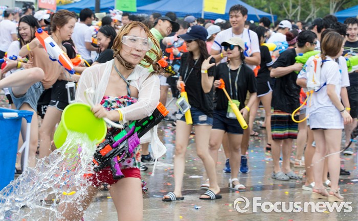 (서울=포커스뉴스) 23일 오후 서울 여의도 한강공원에서 열린 한강 물싸움 축제에서 참가자들이 시원한 물총싸움을 하며 더위를 식히고 있다.