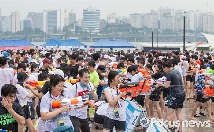(서울=포커스뉴스) 23일 오후 서울 여의도 한강공원에서 열린 한강 물싸움 축제에서 참가자들이 시원한 물총싸움을 하며 더위를 식히고 있다.