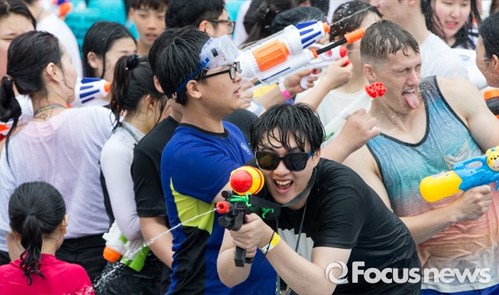 (서울=포커스뉴스) 23일 오후 서울 여의도 한강공원에서 열린 한강 물싸움 축제에서 참가자들이 시원한 물총싸움을 하며 더위를 식히고 있다.