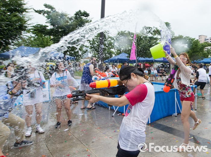 (서울=포커스뉴스) 23일 오후 서울 여의도 한강공원에서 열린 한강 물싸움 축제에서 참가자들이 시원한 물총싸움을 하며 더위를 식히고 있다.