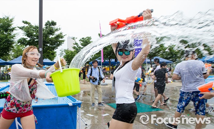 (서울=포커스뉴스) 23일 오후 서울 여의도 한강공원에서 열린 한강 물싸움 축제에서 참가자들이 시원한 물총싸움을 하며 더위를 식히고 있다.