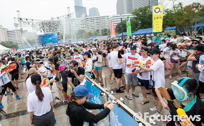 (서울=포커스뉴스) 23일 오후 서울 여의도 한강공원에서 열린 한강 물싸움 축제에서 참가자들이 시원한 물총싸움을 하며 더위를 식히고 있다.