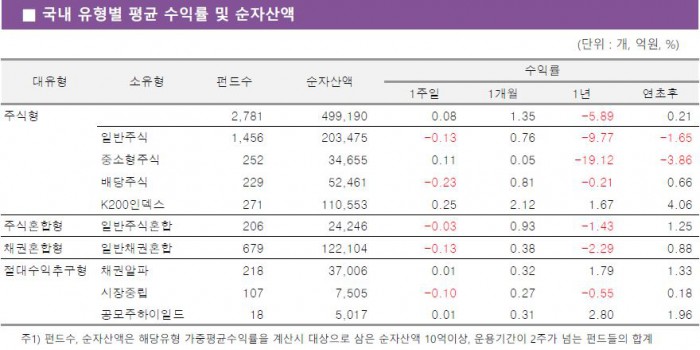 반면 배당주식펀드와 일반주식펀드는 각각 0.23%, 0.13%씩 하락했다.