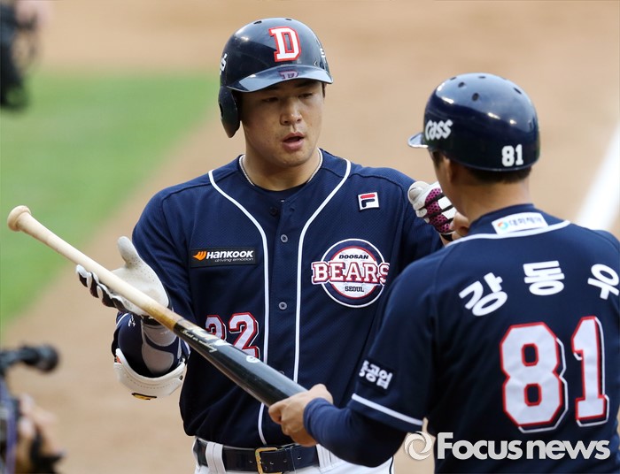 (서울=포커스뉴스) 24일 서울 잠실구장에서 열린 2016 프로야구 두산-LG 경기 2회초 두산 선두타자 김재환이 중월 솔로 홈런을 치고 홈인하며 강동우 코치의 환영을 받고 있다.