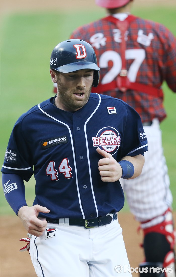(서울=포커스뉴스) 24일 서울 잠실구장에서 열린 2016 프로야구 두산-LG 경기 3회초 2사 2루에서 두산 김재환의 좌전 안타때 2루주자 에반스가 홈인하고 있다.