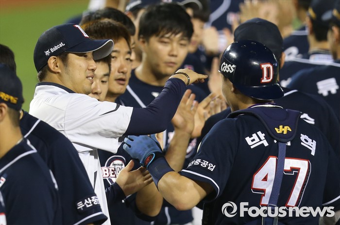 (서울=포커스뉴스) 24일 서울 잠실구장에서 열린 2016 프로야구 두산-LG 경기에서 LG전 7이닝 2실점으로 승리투수가 된 장원준이 포수 박세혁과 손을 마주치며 웃고 있다.