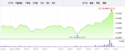 NEW는 25일 오전 9시15분 현재 전 거래일 대비 2.58%(400원) 하락한 1만5100원에 거래되고 있다. NEW는 15일부터 22일까지 1~5%의 상승폭을 기록했다.