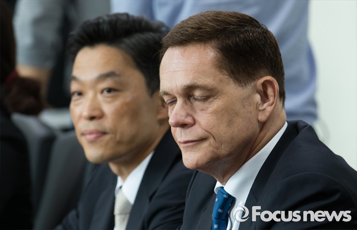 (인천=포커스뉴스) 요하네스 타머(오른쪽) 아우디폭스바겐 사장을 비롯한 관계자들이 25일 오전 인천 서구 국립환경과학원에서 열린 차량 인증 조작 관련 환경부 청문회에 참석해 생각에 잠겨 있다. 왼쪽은 정재균 부사장.
