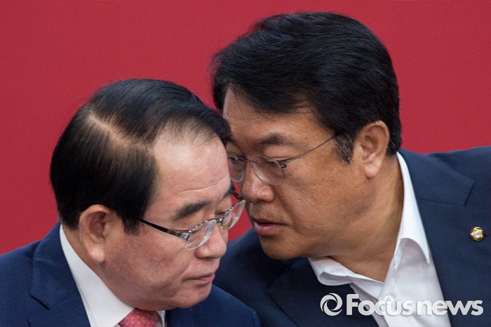 (서울=포커스뉴스) 정진석(오른쪽) 새누리당 원내대표와 박명재 사무총장이 25일 오전 서울 여의도 새누리당사에서 열린 혁신비상대책위원회의에 참석해 대화 하고 있다.