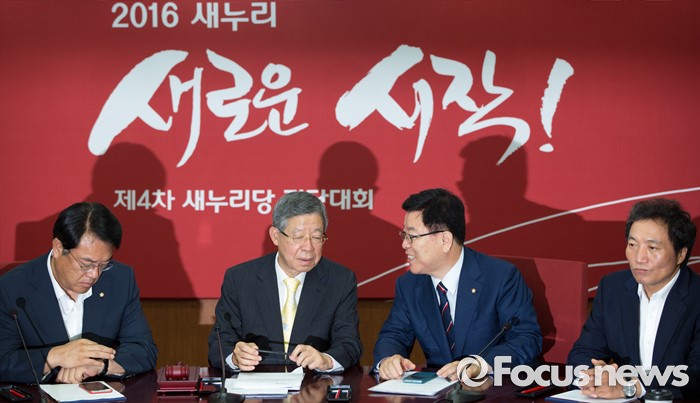(서울=포커스뉴스) 김희옥(왼쪽 두 번째) 새누리당 혁신비상대책위원장과 정진석(오른쪽 두 번째) 정책위의장이 25일 오전 서울 여의도 새누리당사에서 열린 혁신비상대책위원회의에 참석해 대화 하고 있다.