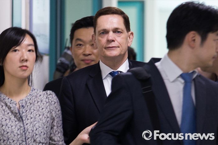 (인천=포커스뉴스) 요하네스 타머(가운데) 아우디폭스바겐 사장이 25일 오전 인천 서구 국립환경과학원에서 열린 차량 인증 조작 관련 환경부 청문회에 참석하고 있다.