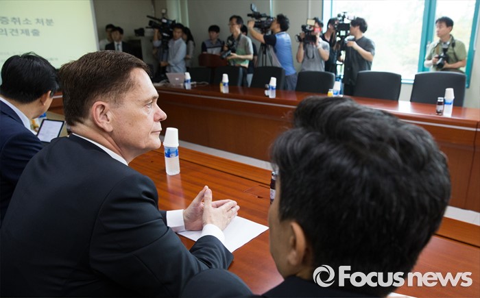 (인천=포커스뉴스) 요하네스 타머(오른쪽) 아우디폭스바겐 사장을 비롯한 관계자들이 25일 오전 인천 서구 국립환경과학원에서 열린 차량 인증 조작 관련 환경부 청문회에 참석해 청문회 시작을 기다리고 있다.