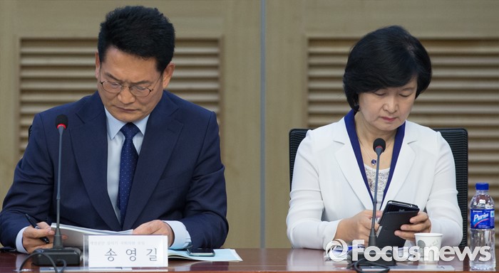 (서울=포커스뉴스) 25일 오전 서울 여의도 국회 의원회관에서 개성공단살리기 국회의원 모임 주최로 열린 개성공단 전면중단, 고도의 정치적 행위 논리 정당한가? 세미나에 전당대회 출마를 선언한 송영길(왼쪽), 추미애 더불어민주당 의원이 참석해 생각에 잠겨 있다.