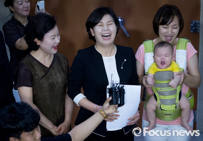 (서울=포커스뉴스) 25일 오전 서울 여의도 국회 정론관에서 양향자 더불어민주당 광주 서구을 지역위원장이 전당대회 최고위원 출마 기자회견을 마친 뒤 취재진 질문에 답하던 중 함께 자리한 한 지지자의 아기 하품에 웃고 있다.
