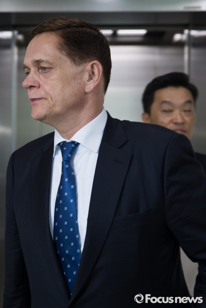 (인천=포커스뉴스) 요하네스 타머(왼쪽) 아우디폭스바겐 사장과 정재균 부사장이 25일 오전 인천 서구 국립환경과학원에서 열린 차량 인증 조작 관련 환경부 청문회를 마친 후 청문회장을 나서고 있다.