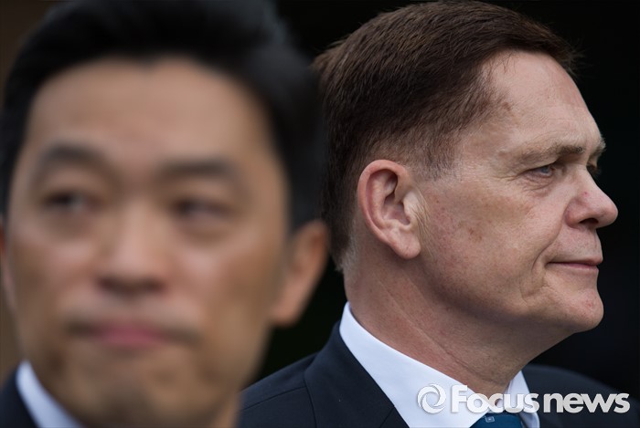 (인천=포커스뉴스) 요하네스 타머(오른쪽) 아우디폭스바겐 사장과 정재균 부사장이 25일 오전 인천 서구 국립환경과학원에서 열린 차량 인증 조작 관련 환경부 청문회를 마친 후 청문회장을 나서며 굳은 표정을 짓고 있다.