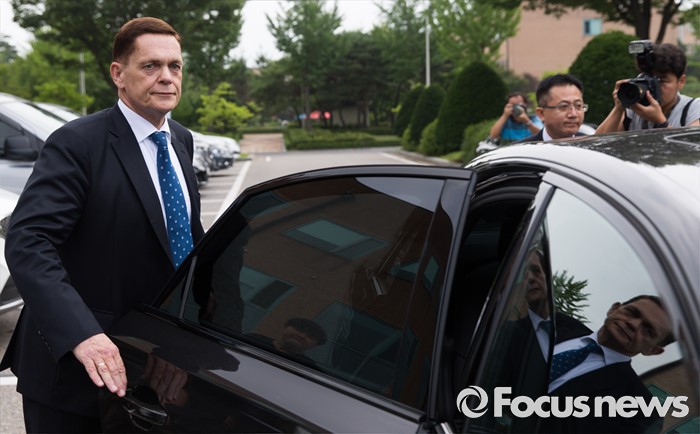 (인천=포커스뉴스) 요하네스 타머(왼쪽) 아우디폭스바겐 사장이 25일 오전 인천 서구 국립환경과학원에서 열린 차량 인증 조작 관련 환경부 청문회를 마친 후 차량에 올라타고 있다.