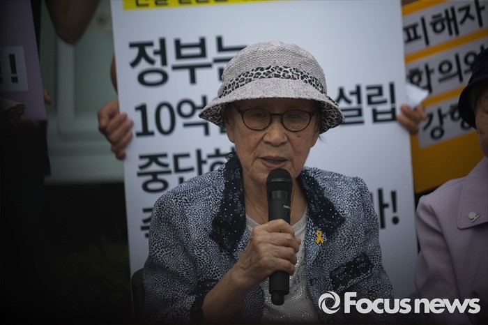 (서울=포커스뉴스) 25일 오전 서울 종로구 정부서울청사 앞에서 화해·치유재단 설립을 강행하는 정부를 규탄하는 정대협(한국정신대문제대책협의회) 및 일본군 위안부 피해자 할머니들의 집회가 열리고 있다.
