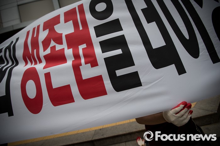 (서울=포커스뉴스) 25일 오전 서울 중구 롯데백화점 앞에서 롯데홈쇼핑 협력사 비상대책위원회원들이 생존권 보장을 촉구하며 집회를 열고 있다.