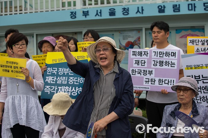 (서울=포커스뉴스) 25일 오전 서울 종로구 정부서울청사 앞에서 화해·치유재단 설립을 강행하는 정부를 규탄하는 정대협(한국정신대문제대책협의회) 및 일본군 위안부 피해자 할머니들의 집회가 열리고 있다.