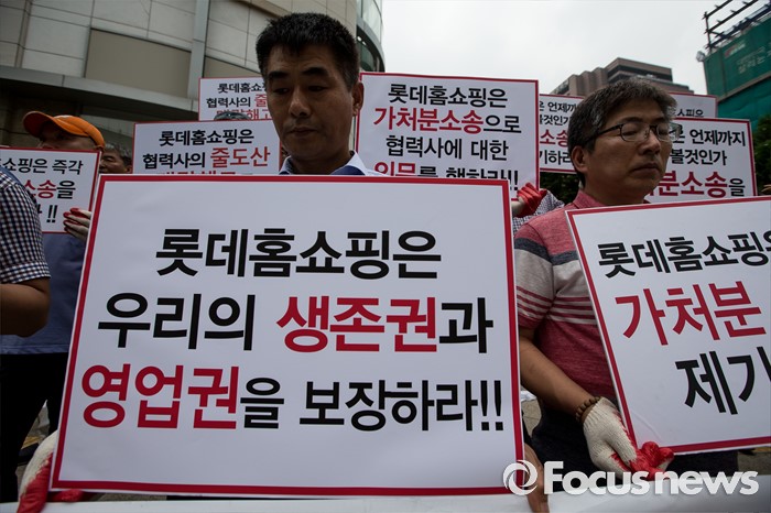 (서울=포커스뉴스) 25일 오전 서울 중구 롯데백화점 앞에서 롯데홈쇼핑 협력사 비상대책위원회원들이 생존권 보장을 촉구하며 집회를 열고 있다.