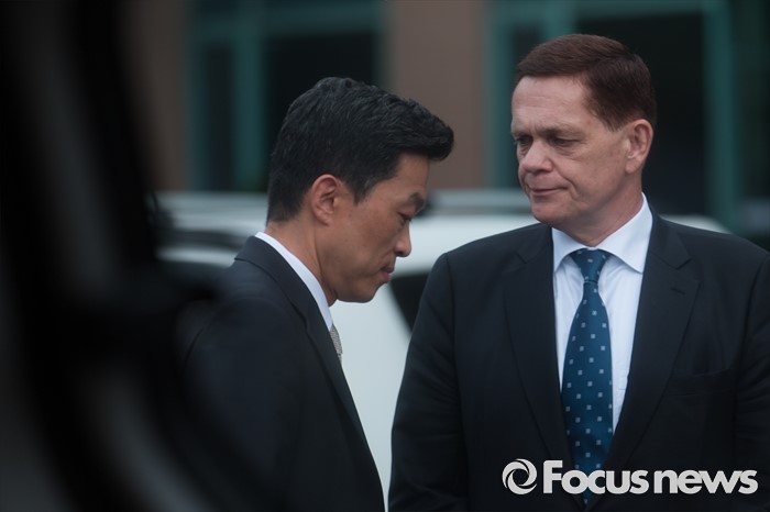 환경부는 이르면 이달말 인증취소·판매금지 조치를 확정할 계획이며, 아우디폭스바겐 코리아는 지난 22일 34개 차종, 79개 모델에 대해 25일부터 자발적으로 판매중단 할 것을 결정한 바 있다.(인천=포커스뉴스) 요하네스 타머(오른쪽) 아우디폭스바겐 사장과 정재균 부사장이 25일 오전 인천 서구 국립환경과학원에서 열린 차량 인증 조작 관련 환경부 청문회를 마친 후 청문회장을 나서며 굳은 표정을 짓고 있다. 2016.07.25 오장환 기자