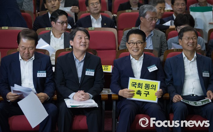 (서울=포커스뉴스) 25일 오후 서울 여의도 국회 의원회관에서 열린 국민의당 지역위원장 임명장 수여식 및 연석회의에 참석한 박주선(왼쪽부터) 국회 부의장, 안철수 전 상임공동대표, 박지원 비상대책위원장, 천정배 전 공동대표가 온국민방송 관련 영상을 시청하고 있다.