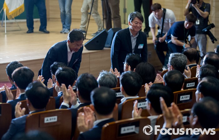 (서울=포커스뉴스) 25일 오후 서울 여의도 국회 의원회관에서 열린 국민의당 지역위원장 임명장 수여식 및 연석회의에 참석한 안철수(오른쪽) 전 상임공동대표, 천정배 전 공동대표가 참석자들을 향해 인사하고 있다.