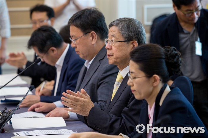 (서울=포커스뉴스) 김희옥(오른쪽 두 번째) 새누리당 혁신비상대책위원장이 25일 오후 서울 여의도 국회에서 열린 '청년 일자리 창출 위한 모바일금융과 핀테크산업 발전 방향 세미나'에 참석해 박수 치고 있다.