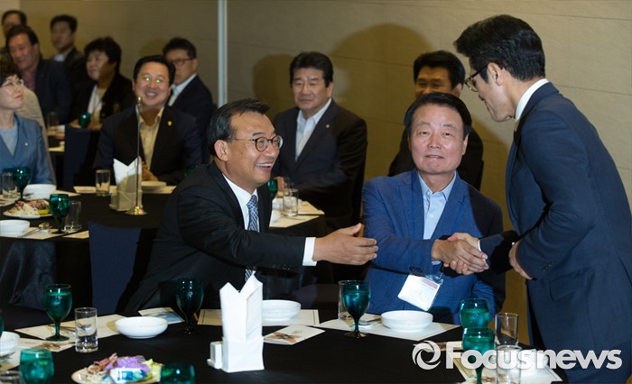 (서울=포커스뉴스) 전당대회 대표최고위원 출마를 선언한 정병국(오른쪽부터), 한선교, 이정현 새누리당 의원이 25일 오후 서울 여의도 중소기업중앙회관에서 열린 중앙위원회 전국시도당연합회 월례회 행사에 참석해 인사하고 있다.