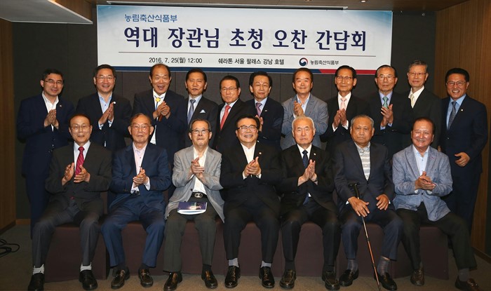 (서울=포커스뉴스) 이동필 농림축산식품부 장관이 25일 서울 쉐라톤 팔래스호텔에서 역대 농림축산식품부 장관을 초청해 박근혜정부 4년차 농정성과, 수출확대 및 6차산업 활성화 등에 대해역대장관들의 의견을 청취하는 농정간담회를 갖고 기념촬영하고 있다. <사진제공=농림축산식품부>