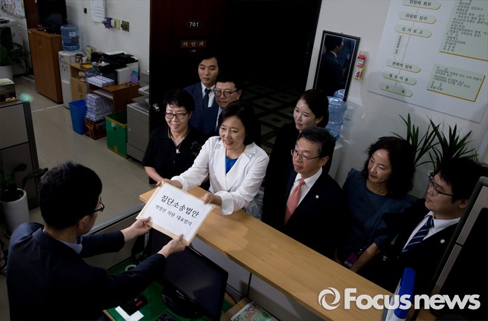 (서울=포커스뉴스) 박영선 더불어민주당 의원과 관계자들이 26일 오전 서울 여의도 국회 의안과에서 집단소송법 제정 법안을 제출하고 있다. 박 의원은 앞서 기자회견을 통해 "미국에만 거액 배상을 합의한 폭스바겐측의 행태는 현행 민사소송법 한계를 드러낸 것으로 우리 국민들의 적절한 피해배상과 신속한 권리구제를 위해 징벌적 배상제 도입과 함께 집단소송제 도입이 시급해 대표발의했다"고 전했다.