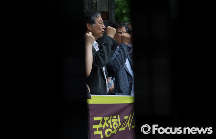 (서울=포커스뉴스) 26일 오전 서울 종로구 헌번법재판소 앞에서 민주사회를 위한 변호사모임과 한국사국정화저지네트워크가 국정화 고시 효력정지 가처분 제기 기자회견을 하고 있다.