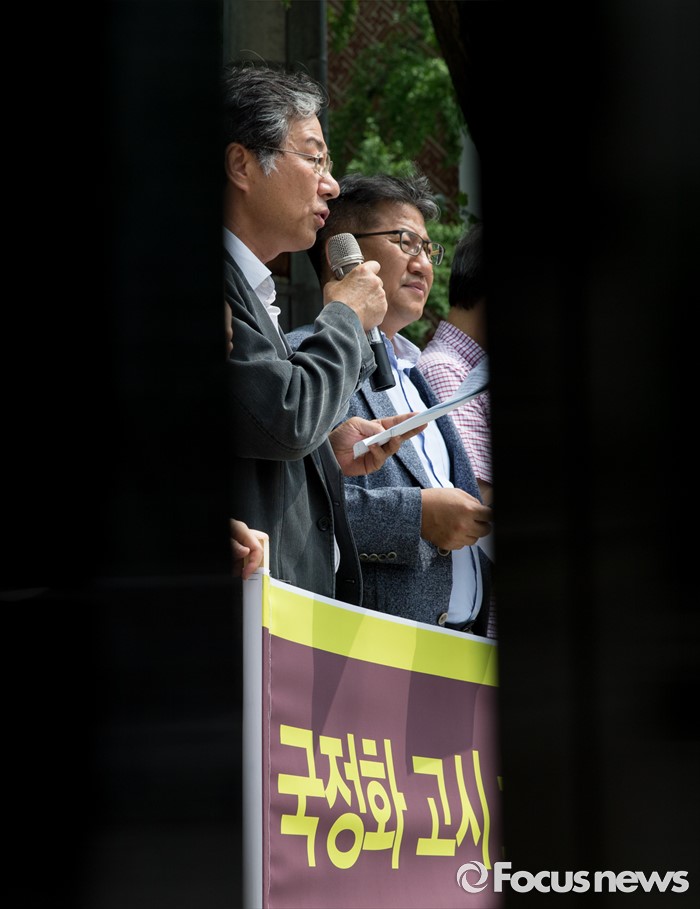 (서울=포커스뉴스) 26일 오전 서울 종로구 헌번법재판소 앞에서 이영기 변호사가 국정화 고시 효력정지 가처분 제기 기자회견에 참석해 발언을 하고 있다.