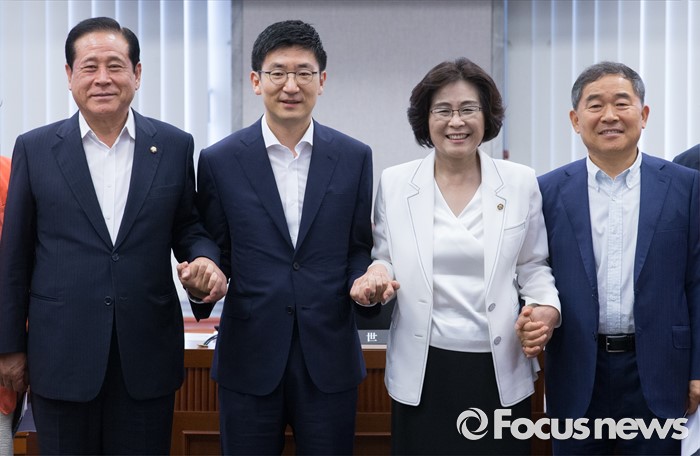 (서울=포커스뉴스) 26일 오전 서울 여의도 국회에서 열린 정치발전특별위원회 전체회의에 참석한 김세연 위원장과 3당 간사가 취재진을 향해 포즈를 취하고 있다. 왼쪽부터 배덕광 새누리당 간사, 김 위원장, 유승희 더불어민주당 간사, 황주홍 국민의당 간사.