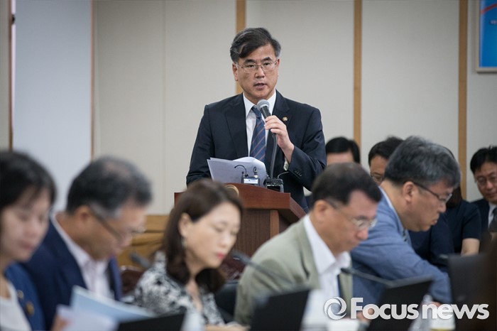 (서울=포커스뉴스) 26일 오전 경기도 정부과천청사 법무부 회의실에서 열린 '가습기 살균제 사고 진상규명과 피해구제 및 재발방지 대책 마련을 위한 국정조사특별위원회'(가습기 특조위) 법무부-공정위 진상규명을 위한 현장조사에서 김학현 공정거래위원회 부위원장이 현안보고를 하고 있다.