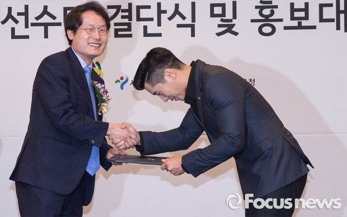 (서울=포커스뉴스) 26일 오전 서울 종로구 세종문화회관에서 열린 '2016 전국기능경기대회 서울특별시 선수단 결단식 및 홍보대사 위촉식'에 참석한 조희연(왼쪽) 서울시 교육감이 가수 브라이언과 악수를 학 ㅗ있다.
