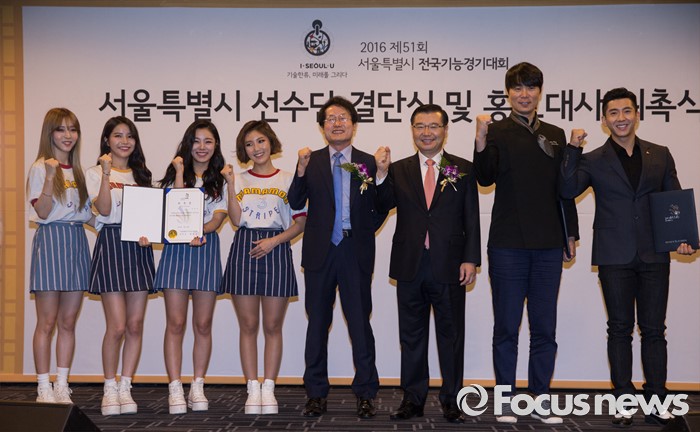 (서울=포커스뉴스) 26일 오전 서울 종로구 세종문화회관에서 열린 '2016 전국기능경기대회 서울특별시 선수단 결단식 및 홍보대사 위촉식'에 참석자들이 기념촬영을 하고 있다. 왼쪽부터 걸그룹 마마무의 문별, 솔라, 휘인, 화사, 조희연 서울시 교육감, 류경기 서울시 행정1부시장, 요리사 최현석, 가수 브라이언.