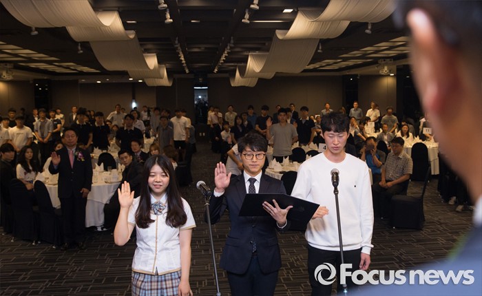 (서울=포커스뉴스) 26일 오전 서울 종로구 세종문화회관에서 열린 '2016 전국기능경기대회 서울특별시 선수단 결단식 및 홍보대사 위촉식'에 참석한 선수단 대표가 선서를 하고 있다.
