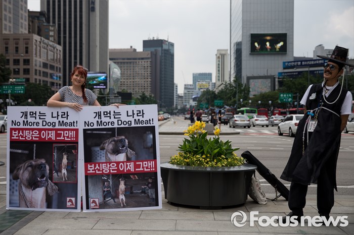 (서울=포커스뉴스) 26일 오전 서울 종로구 광화문광장에서 세이브 코리언 독스 회원(왼쪽)이 개고기 문화를 반대하는 피켓을 들고 있다.