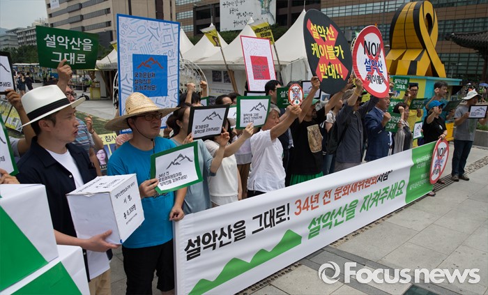 (서울=포커스뉴스) 26일 오전 서울 광화문광장에서 열린 설악산 케이블카 반대 기자회견에 참석한 설악산국립공원지키기 국민행동 회원들이 케이블카 취소 촉구 피켓을 들며 구호를 외치고 있다.