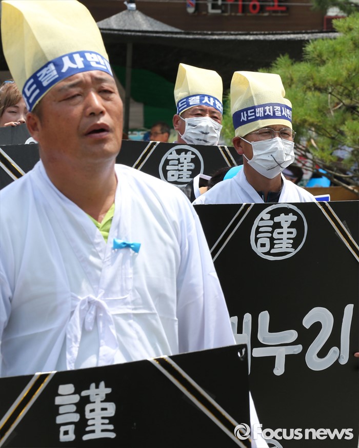 (성주=포커스뉴스) 26일 오전 경북 성주군청을 찾은 정신석 새누리당 원내대표와 지도부들이 성주군민들과 간담회를 가진 가운데 성주주민들이 사드배치 반대를 촉구하고 있다.