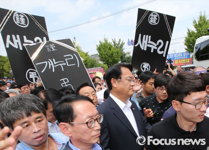 (성주=포커스뉴스) 26일 오전 경북 성주군청을 찾은 정신석 새누리당 원내대표와 지도부들이 성주군민들과 간담회를 마치고 군청을 나와 버스로 이동중 주민들에게 항의를 받고 있다.