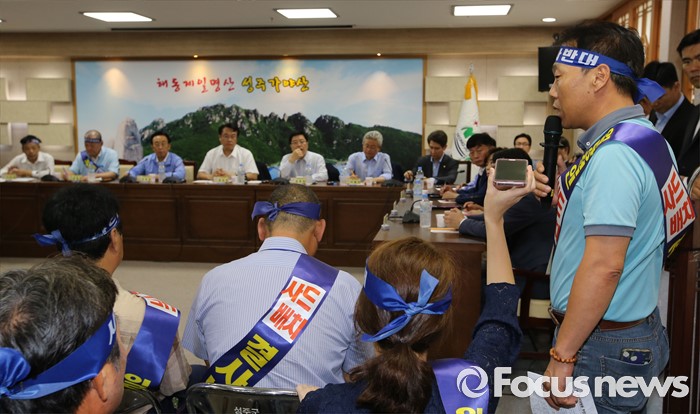 (성주=포커스뉴스) 26일 오전 경북 성주군청을 찾은 정신석 새누리당 원내대표와 지도부들이 성주군민들과 간담회에서 주민에게 질문을 받고 있다.
