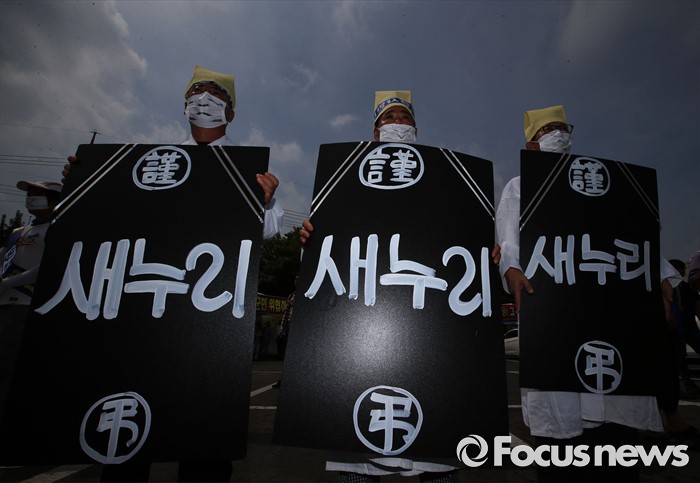 (성주=포커스뉴스) 26일 오전 경북 성주군청을 찾은 정신석 새누리당 원내대표와 지도부들이 성주군민들과 간담회를 가진 가운데 성주주민들이 사드배치 반대를 촉구하고 있다.