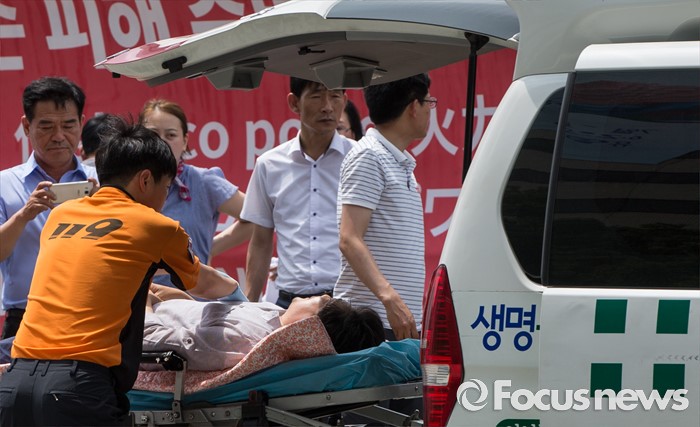 (서울=포커스뉴스) 석탄화력발전소 증설 중단을 요구하며 단식농성을 일주일 째 이어오던 김홍장 당진시장이 26일 오후 서울 종로구 광화문광장에서 건강 이상으로 들것에 실려 구급차로 향하고 있다.