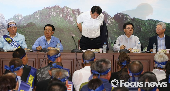(성주=포커스뉴스) 26일 오전 경북 성주군청을 찾은 정신석 새누리당 원내대표가 성주군민들과 간담회 중 웃옷을 벗고 있다.