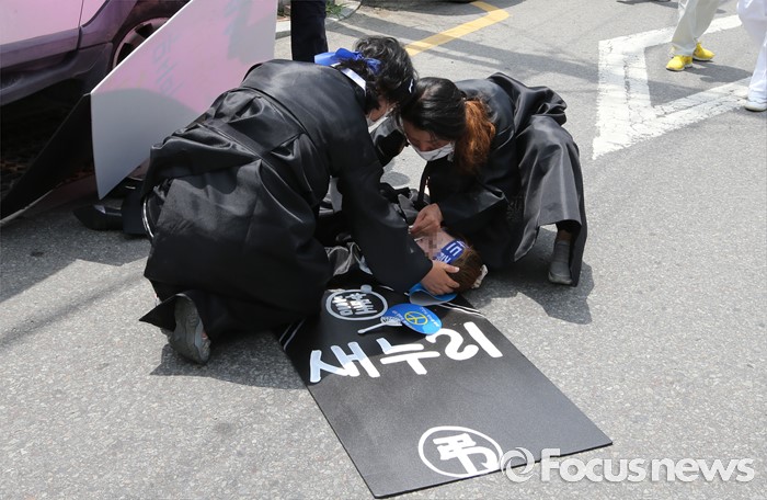 (성주=포커스뉴스) 정신석 새누리당 원내대표와 지도부들이 26일 오전 경북 성주군청에서 성주군민들과 간담회를 마치고 떠난뒤, 여성 주민이 실신해 도로에 쓰러져 있다.