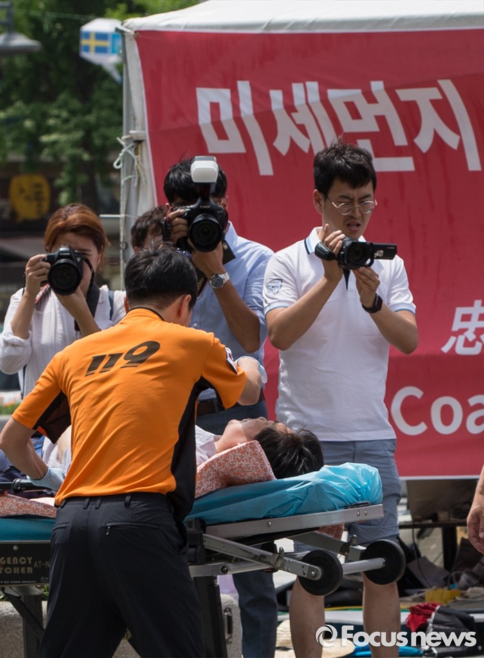 (서울=포커스뉴스) 석탄화력발전소 증설 중단을 요구하며 단식농성을 일주일 째 이어오던 김홍장 당진시장이 26일 오후 서울 종로구 광화문광장에서 건강 이상으로 들것에 실려 구급차로 향하고 있다.
